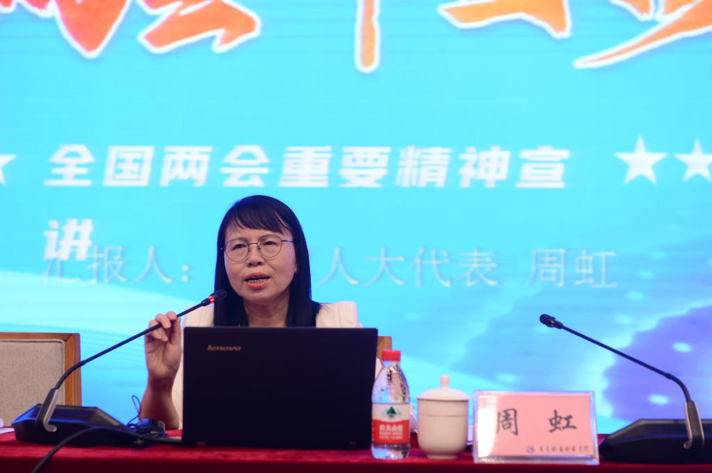 全国人大代表、我校经济与管理学院院长周虹教授结合参会经历,分享了第十四届全国人大会议的盛况、主要议程等,重点传达了习近平总书记在参加江苏代表团审议、看望民建工商联界委员时的重要讲话精神。她表示,全国两会再次明确了党中央始终坚持“两个毫不动摇”、“三个没有变”,始终把民营企业和民营企业家当作自己人,民营经济是我们党长期执政、团结带领全国人民实现“两个一百年”奋斗目标和中华民族伟大复兴中国梦的重要力量。