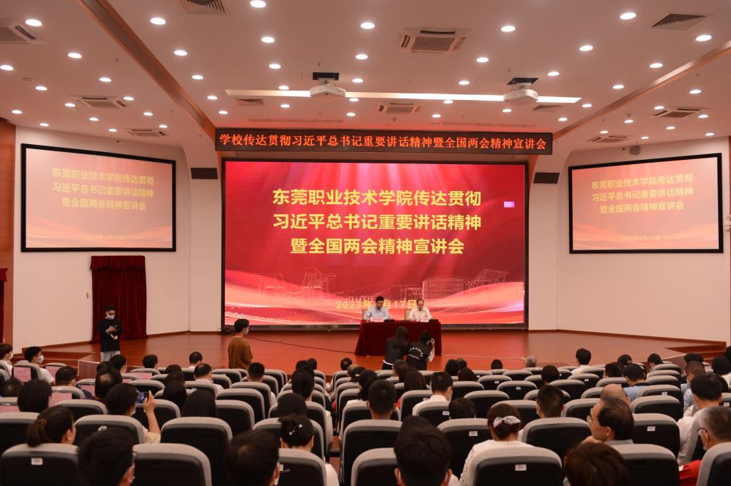 会上,贺定修校长全面传达省市关于学习贯彻习近平总书记在全国两会上的重要讲话精神和全国两会精神的内容。他指出,2023年全国两会是贯彻落实党的二十大精神开局之年召开的一次重要会议。习近平总书记全票当选国家主席、中央军委主席,反映了全体全国人大代表的共同意志和全国各族人民的共同心愿,极大鼓舞和激励亿万人民更加紧密地团结在以习近平同志为核心的党中央周围,为实现党的二十大确定的目标任务共同奋斗。围绕领悟好、宣传好、贯彻好、落实好习近平总书记重要讲话精神和全国两会精神,他强调,要坚定紧跟习近平总书记奋进新征程的信心和决心,聚焦推动高质量发展,围绕省、市作出的各项战略部署,落实重点工作,扎实推进中国式现代化的广东实践,积小胜为大胜,以真功夫、实功夫推动多方面工作走在前列。