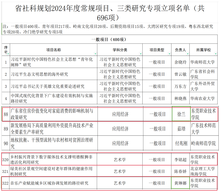 近日,广东省哲学社会科学规划领导小组办公室发布《广东省哲学社会科学规划2024年度常规项目与三类研究专项立项名单》,我校喜获3项省哲学社会科学规划项目一般项目立项,分别为:徐兰老师的《广东省住房价值变化对家庭消费的影响机制与政策研究》、李铭超老师的《乡村振兴背景下数字媒体技术支撑明德醒狮非遗活化利用研究》以及黄琳娜老师的《音乐产业赋能城乡区域协调发展的路径研究》。立项数在全省高职院校排名第3位。