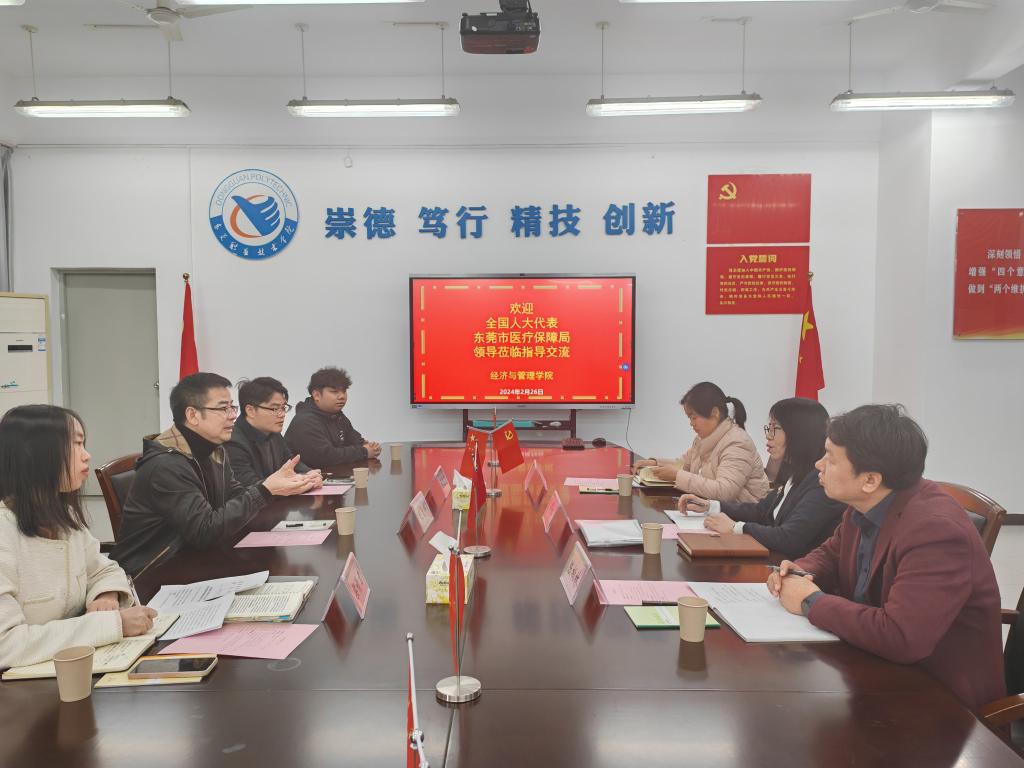 2024年2月26日上午,十四届全国人大代表、东莞市横沥镇社区卫生服务中心主管护师莫幼坤,东莞市医疗保障局党组成员、副局长胡文辉一行到我校开展调研交流活动。全国人大代表、我校经济与管理学院院长周虹,经济与管理学院党总支书记陈柏林参加本次交流活动。双方就高等职业教育、东莞市医疗保障相关问题开展座谈交流。