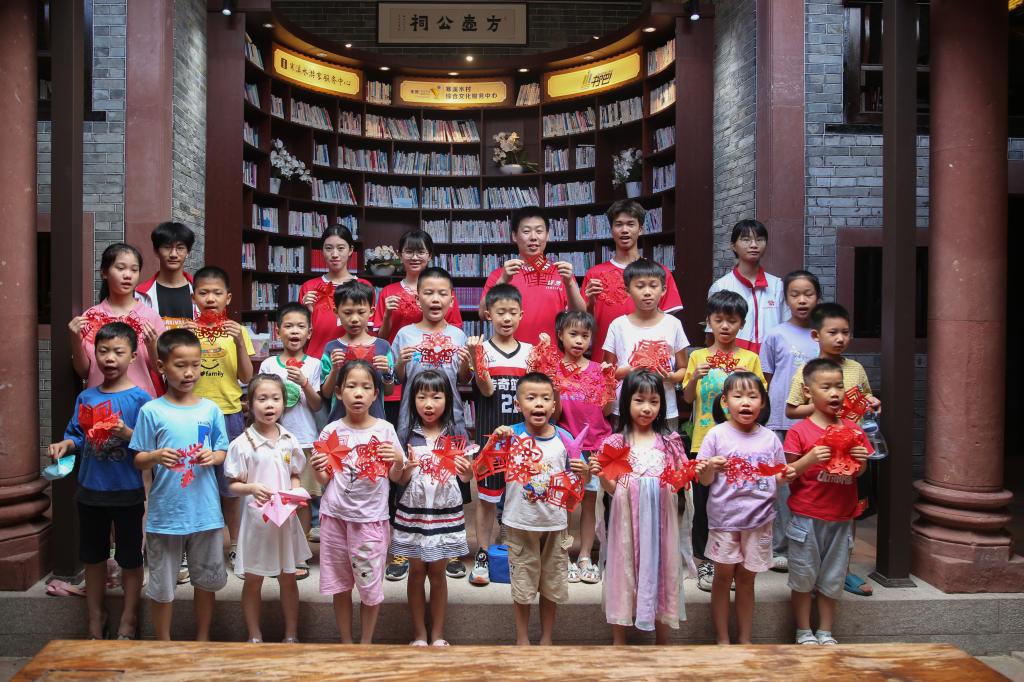 茶山镇寒溪水村是一个拥有近800年历史的古村落,涌现出以罗涛、罗柱、罗立斌、罗克明等为代表的革命烈士。带着传承红色基因的使命,团队挖掘红色文化内涵与艺术特征,创新设计具有红色文化特色的美育课程,将五角星、国旗、党徽、红色故事等红色文化设计元素融入剪纸、拓印等美育课程教学中,将红色精神通过美育课堂的形式,向孩子们进行传播。