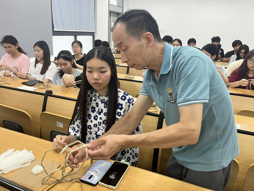 讲座伊始,王浩均详细介绍了“莞城花灯”的制作技艺,分享了作为非遗传承人的匠心坚守以及对传统技艺创新发展的探索。随后,王浩均指导学生制作“莞城花灯”,同学们跟随他的讲解动手实践,部分同学还创新了新的花灯形状,现场氛围活跃。